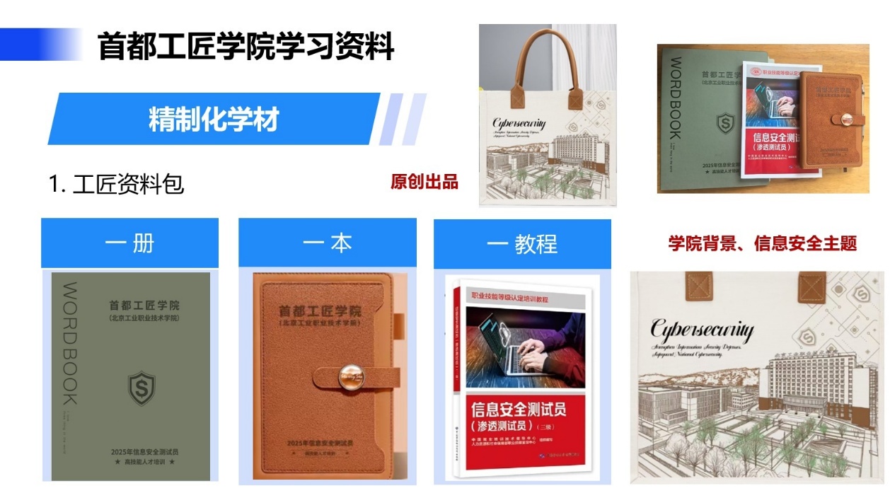 为学员创新推出了“工匠资料包”,采用“一册一本一教程”的产教一体化培训模式。其中的“一册”是独创新形态实训手册,并配课后理论巩固习题,对标人社部职业技能鉴定中心的信息安全测试员考试题库,确保了学习的规范性与权威性。