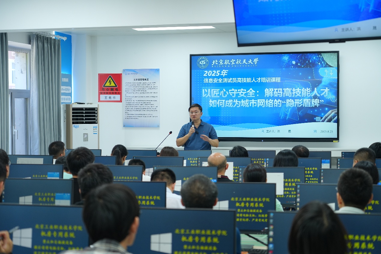 8月25日上午,开班仪式在学校匠心楼三层报告厅隆重举行。学校党委常委、副院长高世吉出席并致欢迎辞,他强调:“信息安全测试员作为数字时代的‘安全卫士’,是维护首都经济社会稳定发展的核心力量,本次培训正是响应国家网络安全战略、培育高端技能人才的关键举措。”