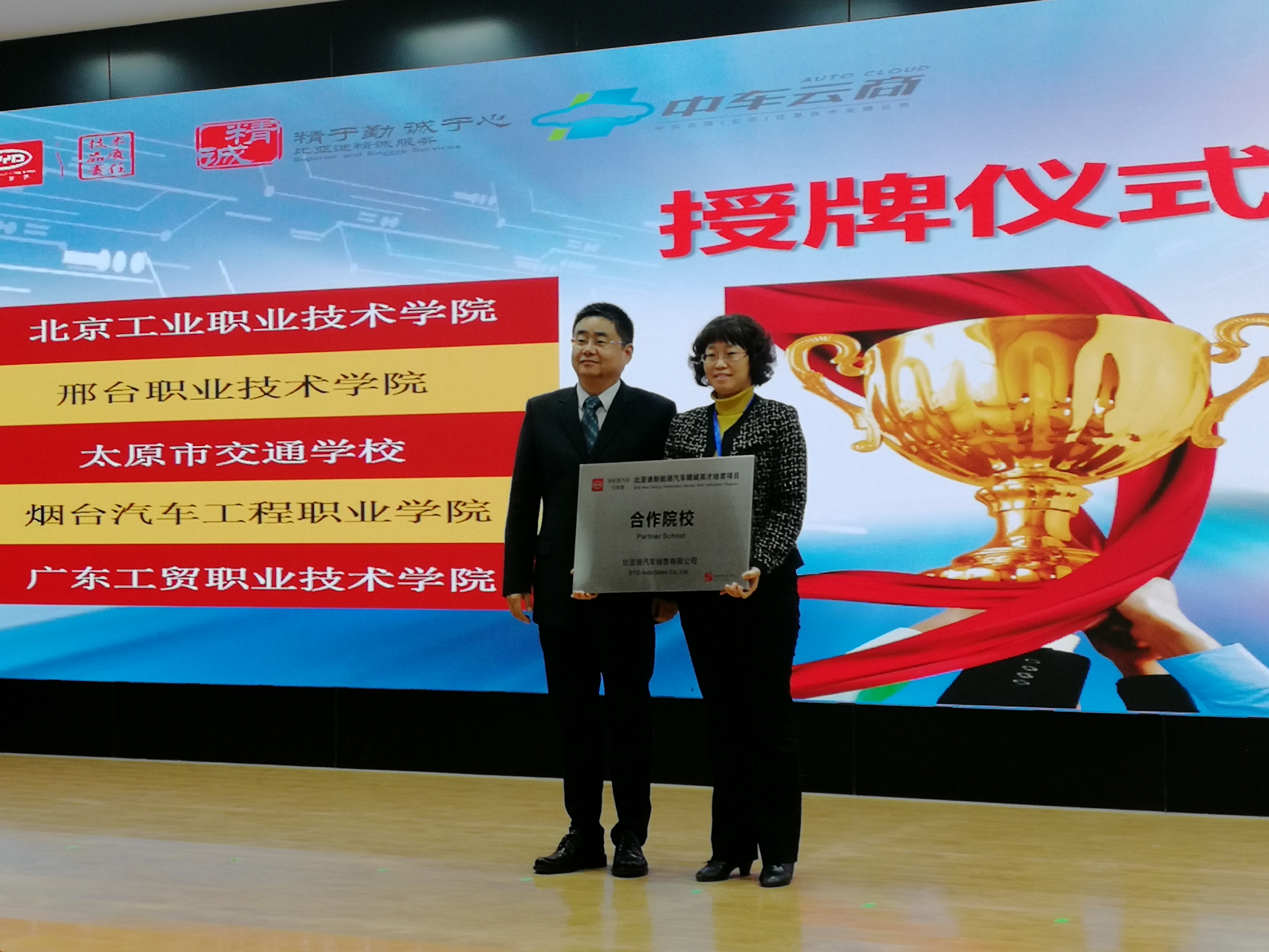 2017年10月31日,“比亚迪精诚英才培育项目”首批校企合作授牌仪式暨项目推进研讨会在武汉城市职业学院举办。“比亚迪精诚英才培育项目”是比亚迪股份有限公司首次携手职业院校进行新能源汽车技术人才的培养,项目组通过半年多时间对众多职业院校进行了考察和选拔,最终通过了11家职业院校作为首批校企合作单位,我校汽车专业以较强的实力通过选拔,成为首批校企合作单位之一,也是北京市唯一一所合作院校。机电工程学院张春芝院长及汽车教研室主任高吕和参加了本次会议。