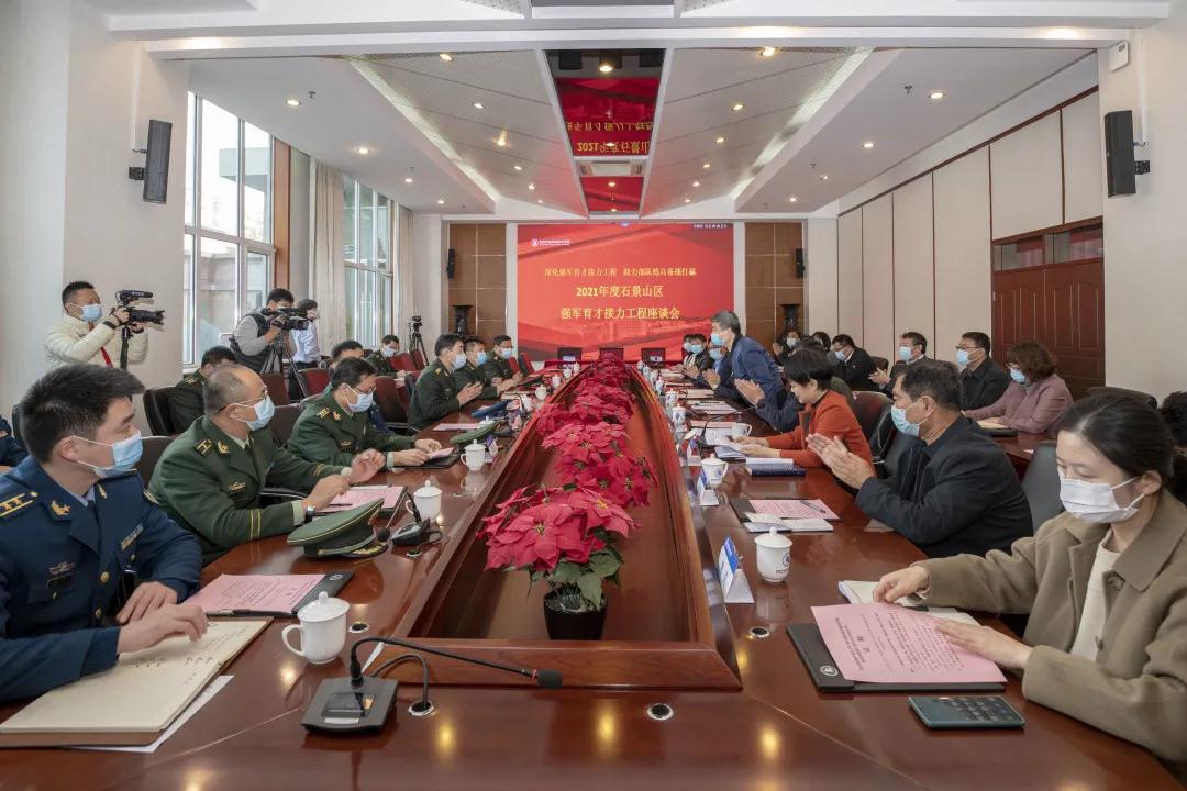 石景山区人民政府副区长王其志,学校党委书记高喜军、校长安江英、副校长刘兰明及相关部门负责人,石景山区退役军人事务局领导、各驻区部队首长,其他院校领导参加了座谈交流和签约仪式。