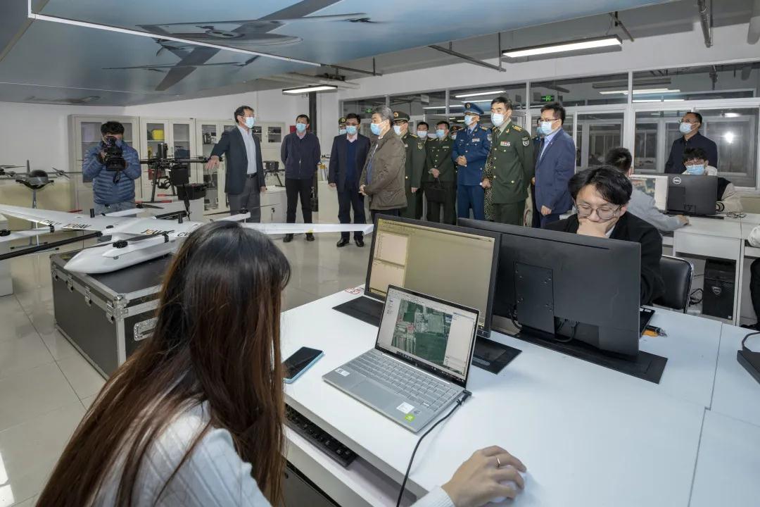 座谈会前,参会军地领导一同参观了学校“强军育才工程”培训基地一隅——无人机实训基地,听取了学校开展的“冬奥会”、“精准扶贫”等技术服务项目和部队官兵无人机操控培训、职业资格证书考培情况汇报。