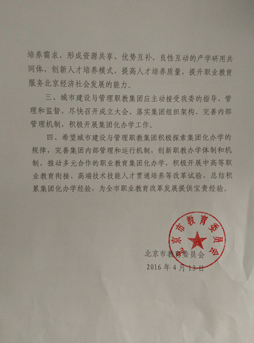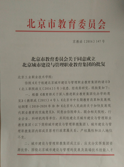 会上刘兰明副校长宣读了北京市教育委员会京教函【2016】第147号文件,文件批复同意由我校牵头组建北京城市建设与管理职业教育集团。
