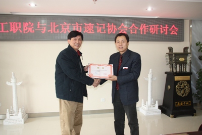 上,我院学生提供现场速录服务,速记协会给予了大量专业指导,学生在现场的表现得到了与会各界专家、代表的一致肯定和如潮好评,我院速录专业在全国跃居行业前列,提高了知名度。陈院长希望将来双方能继续加大合作的力度,获得双赢。之后,陈院长为北京市速记协会副会长唐可为教授颁发了客座教授聘书。